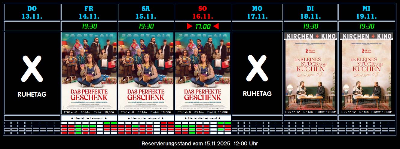 Öffnungszeiten des Kinos: 60 - 45 Minuten vor dem Beginn der Filmvorführung. An Ruhetagen (X) geschlossen.