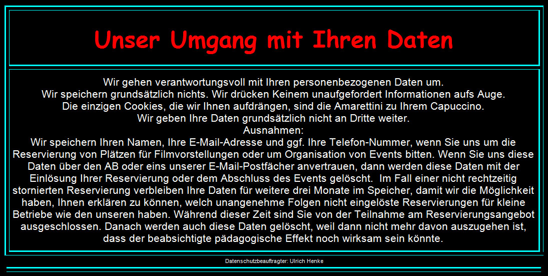 Erreichbarkeit während der Öffnungszeiten: eine Stunde vor dem Filmstart bis Filmende, beachten Sie bitte eventuelle Ruhetage.