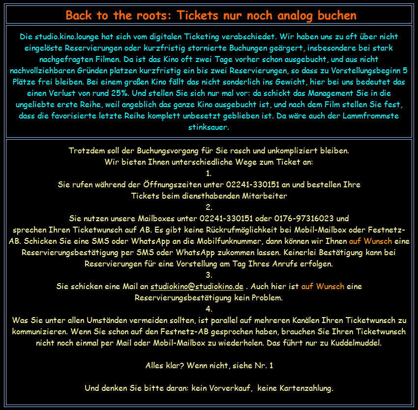 Reservierte Tickets bitte bis spätestens 15 Minuten vor Filmbeginn abholen.