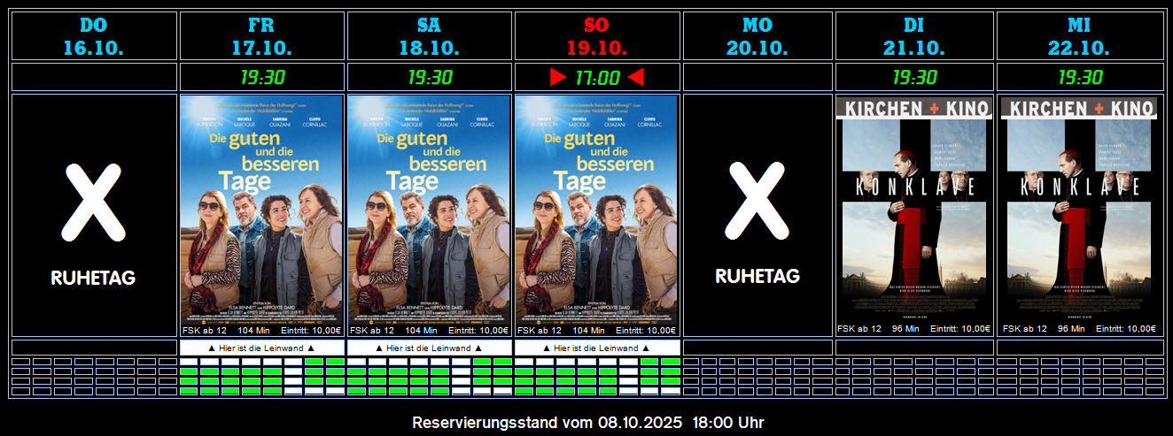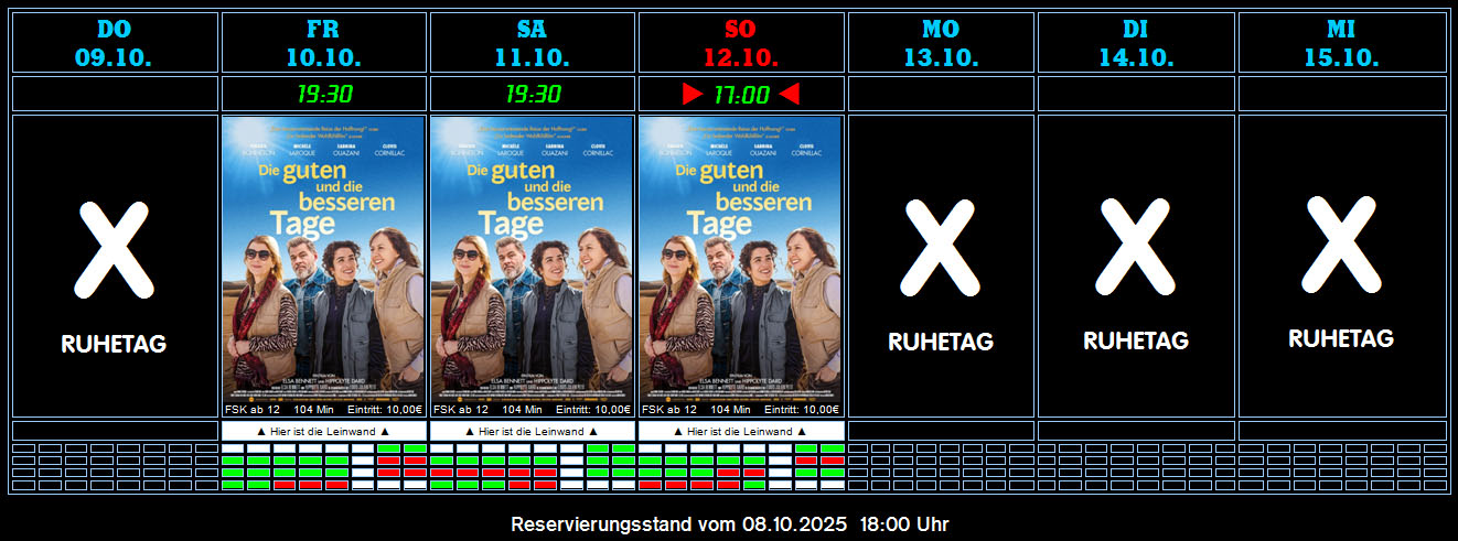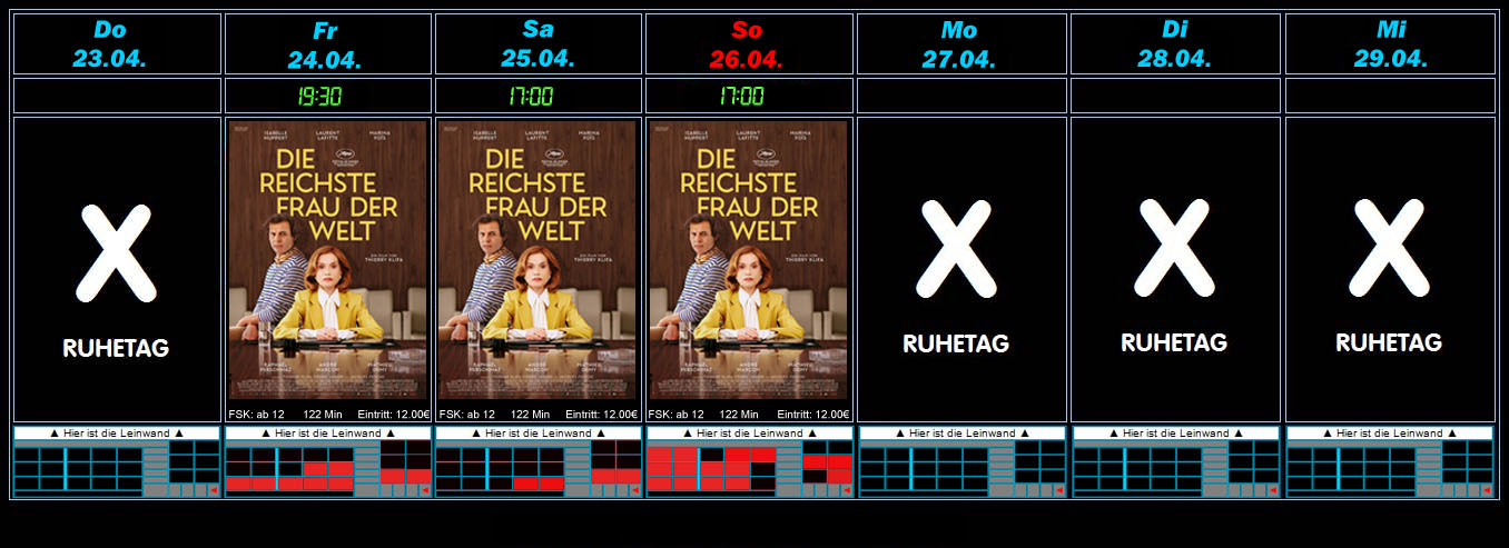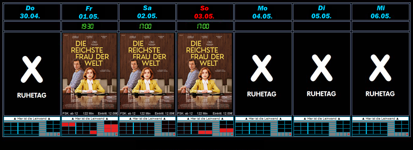 Öffnungszeiten des Kinos: 60 - 45 Minuten vor dem Beginn der Filmvorführung. An Ruhetagen (X) geschlossen.